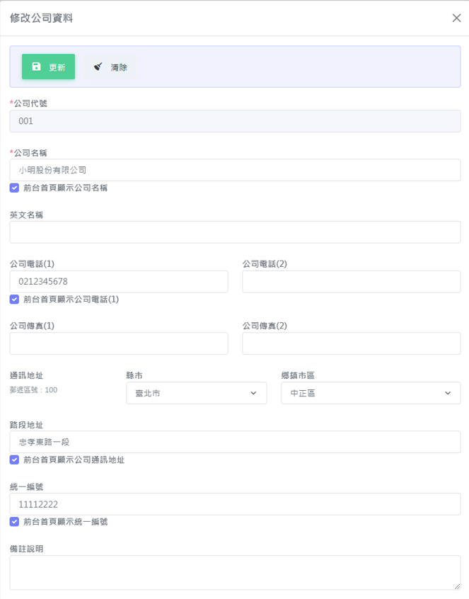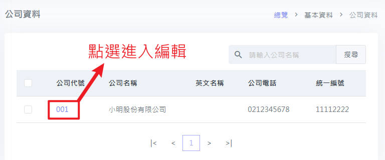 登入完成後點選左方功能列「基本資料」=>「公司資料」=>點選公司代號進入編輯模式(只允許編輯,無法新增與刪除)