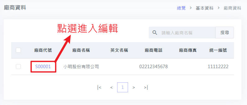 登入完成後點選左方功能列「基本資料」=>「廠商資料」=>點選廠商代號進入編輯模式(只允許編輯,無法新增與刪除)