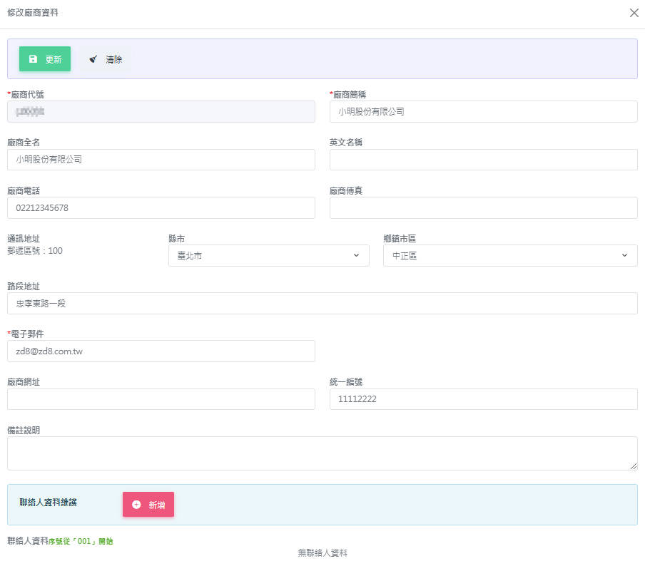「修改廠商資料」畫面下方可新增聯絡人(廠商聯絡窗口)