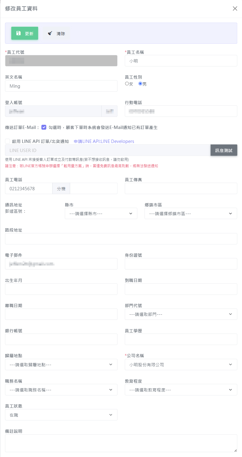 員工傳真:輸入傳真號碼,參考格式例 0229691234。