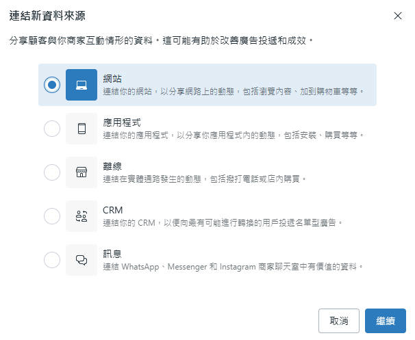 | 搜尋 | 在您網站、應用程式或其他資產進行的搜尋。例如:產品搜尋或旅遊搜尋。 | fbq('track', 'Search'); |