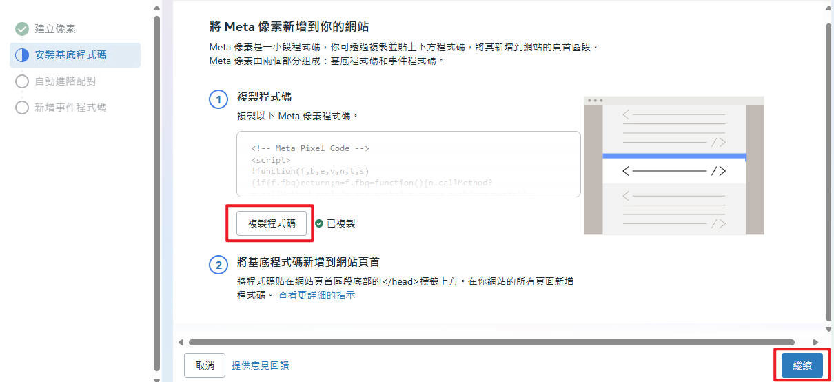 | 完成註冊 | 提交資訊以換取您商家提供的服務。例如:註冊電子郵件訂閱。 | fbq('track', 'CompleteRegistration'); |