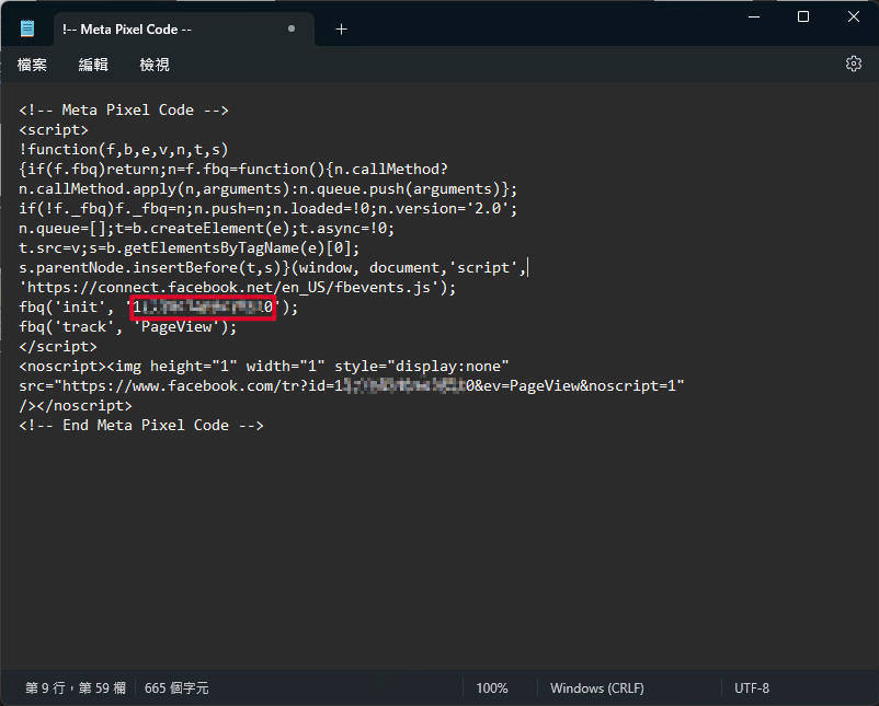 | 購買 | 購買操作完成,這通常代表收到訂單、購買確認函,或是交易收據。例如:進入「感謝您」或確認頁面。 | fbq('track', 'Purchase', {value: 0.00, currency: 'USD'}); |