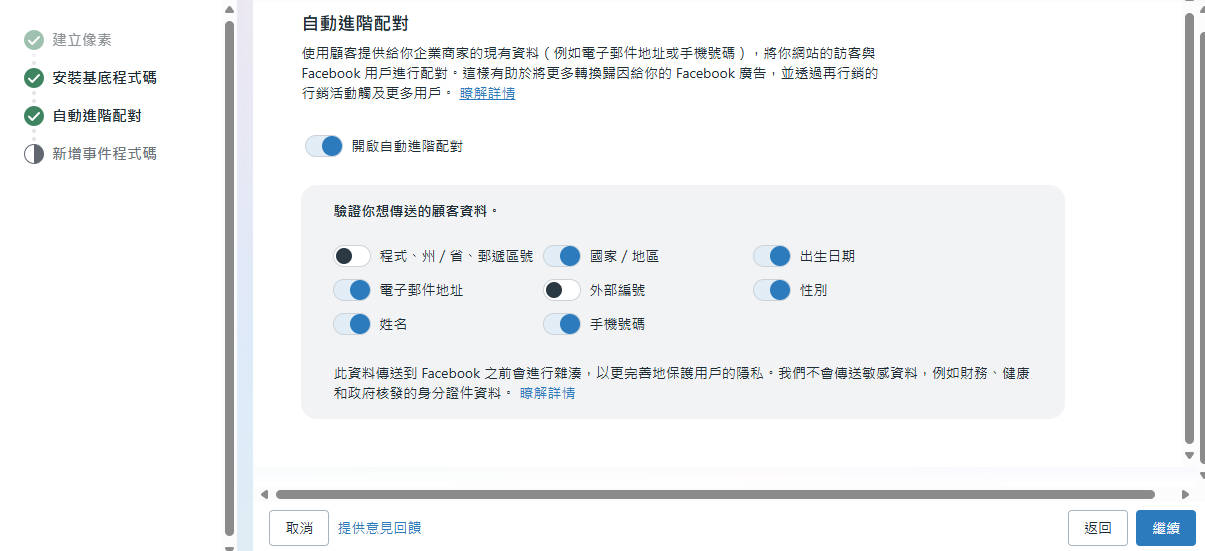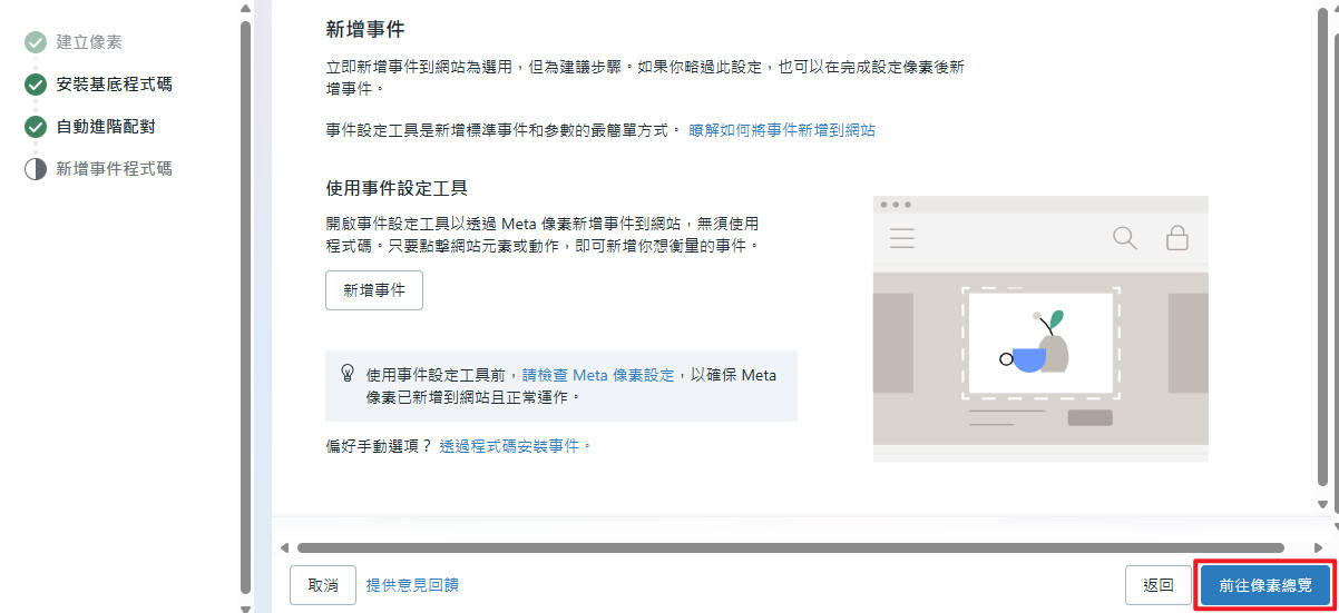 | 新增付款資料 | 在結帳程序新增顧客付款資料。例如:點擊能儲存帳單資訊的按鈕。 | fbq('track', 'AddPaymentInfo'); |